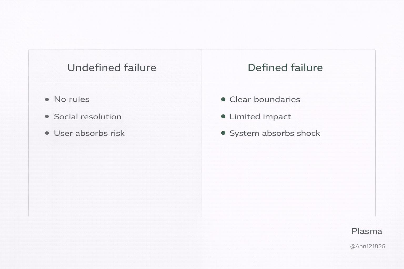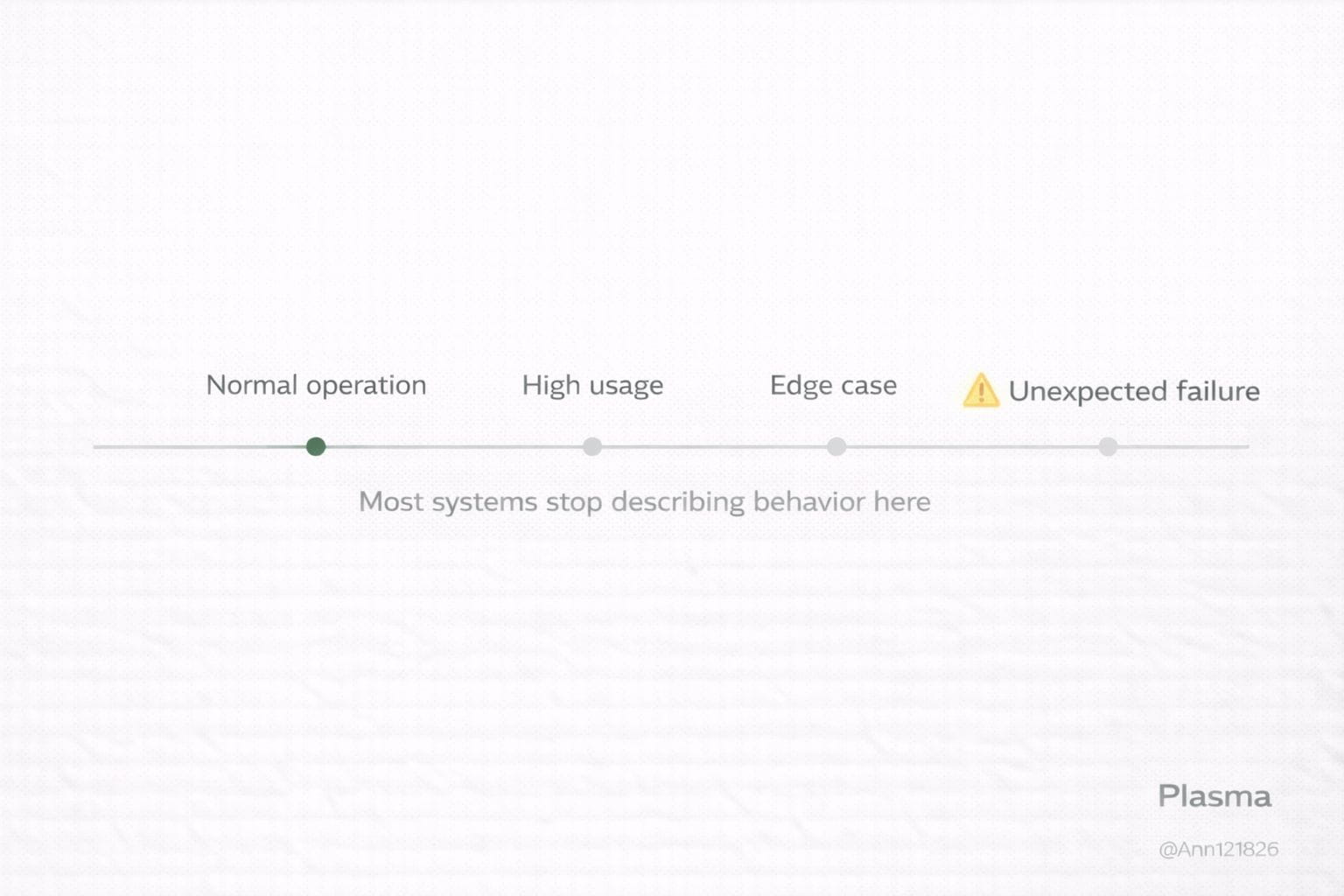 Plasma исходит из другой предпосылки. Если сеть предназначена для перемещения ценности, она должна явно определить, как она себя ведет не только когда все работает, но и когда что-то ломается. Недостаточно, чтобы система была эффективной в нормальных условиях; она должна быть понятной и ограниченной в условиях сбоя. В финансах неясность во время ошибки является формой системного риска.
