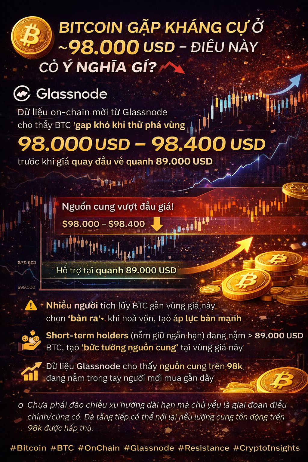 Vùng ~$98 000 hiện là điểm tâm lý quan trọng khi nhiều người mua trước đó có chi phí hoà vốn tại đây — điều này tạo ra áp lực bán nhất thời và kìm hãm đà tăng. Việc quan sát nguồn cung on-chain và hành vi của nhóm người nắm giữ ngắn hạn/ dài hạn là cách giúp bạn hiểu rõ hơn về cấu trúc thị trường Bitcoin hiện tại.