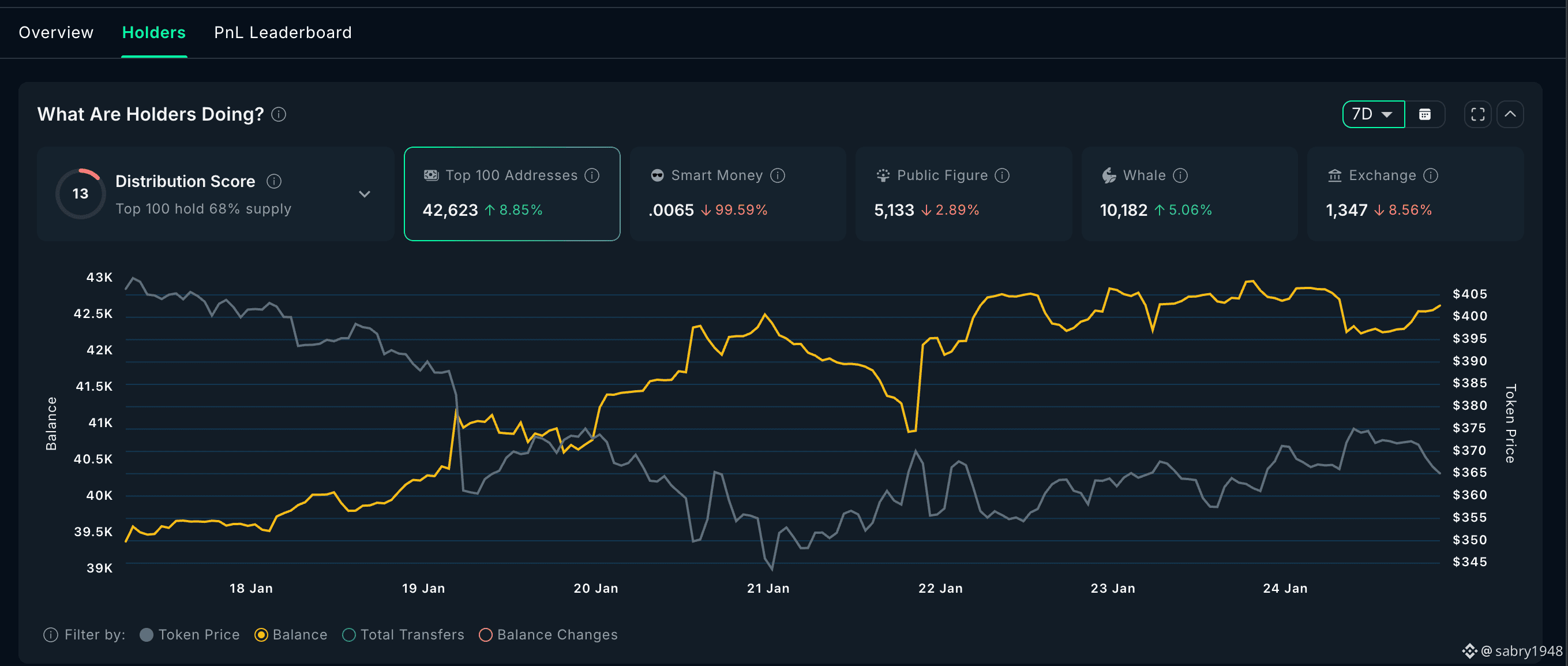 على مدار الأيام السبعة الماضية، زادت الحيتان الكبرى (أعلى 100 عنوان) من حيازاتها ZEC بنسبة تقارب 9%، مرتفعة الرصيد إلى حوالي 42,623 ZEC. هذا يعني تراكماً صافياً قريباً من 3,500 ZEC خلال مرحلة الارتداد.