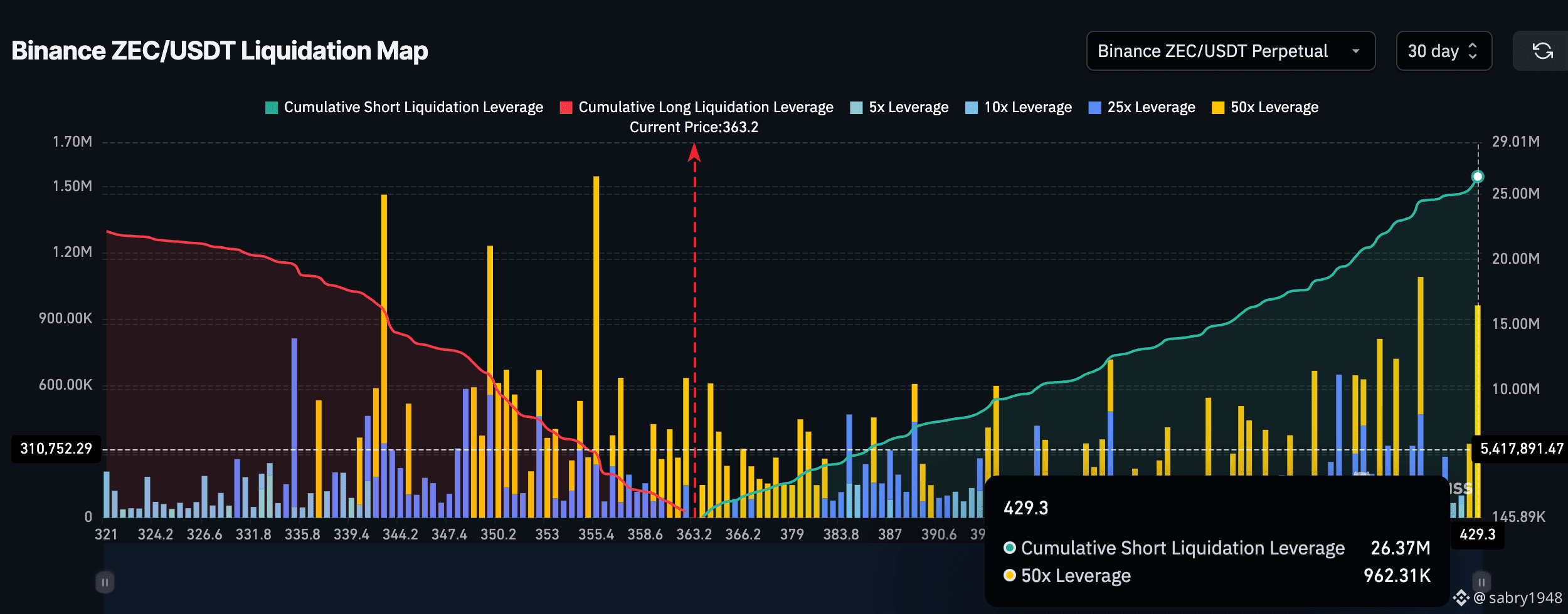 يضيف وضع المشتقات طبقة أخرى. بعد التحرك الأخير، أعيد تعيين الرافعة المالية، محولة إلى متوازنة في الغالب. على مدار الـ30 يوماً القادمة على عقود ZEC الدائمة في بينانس، لا تزال تصفيات البيع القصير تفوق الطويلة بـ26.37 مليون دولار مقابل 22 مليون دولار في الطويلة.