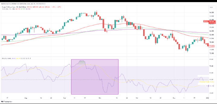 Ниже представлен снимок свечного анализа цен на нефть (например, Brent Crude), показывающий волатильность, связанную с геополитическими событиями — напряженность отражается в ценах рисков:
