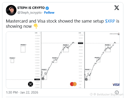 Криптоаналитик Стеф Ис Крипто только что опубликовал сравнение, которое трудно игнорировать: XRP показывает ту же структурную настройку, что и Mastercard и Visa перед их историческими скачками. Дайте этому осесть на секунду.