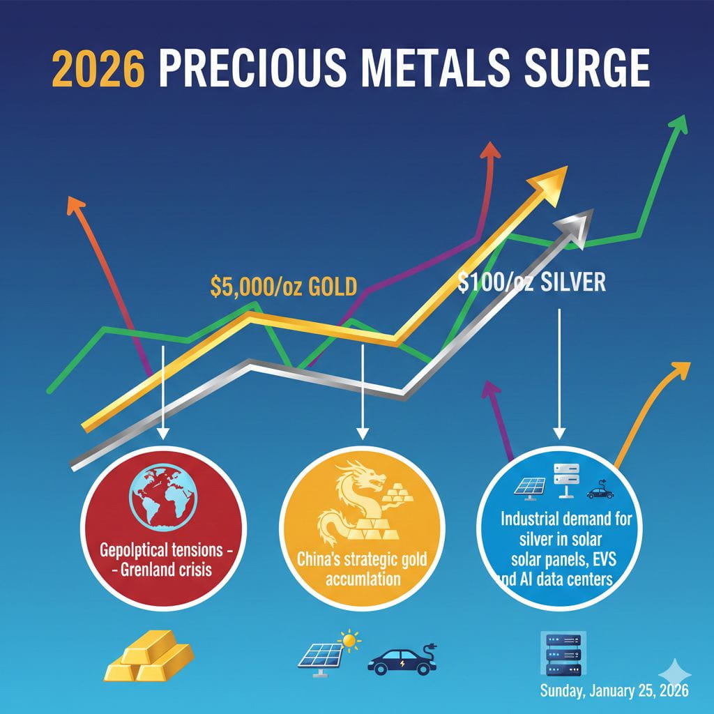 В начале 2026 года финансовый ландшафт мира меняется кардинально, подстегнутый массовым ростом цен на золото и серебро. Эти металлы, когда-то рассматриваемые в основном как традиционные инвестиционные хеджирования, теперь рассматриваются как стратегические активы для национальной безопасности. Причина проста: доверие к глобальной бумажной финансовой системе — таким валютам, как доллар США — ослабевает, в то время как материальные активы, такие как золото и серебро, становятся самыми безопасными хранителями ценности. Золото поднялось к $5,000 за унцию, а серебро преодолело отметку $100, сигнализируя о полном изменении в том, как мир оценивает эти металлы.
