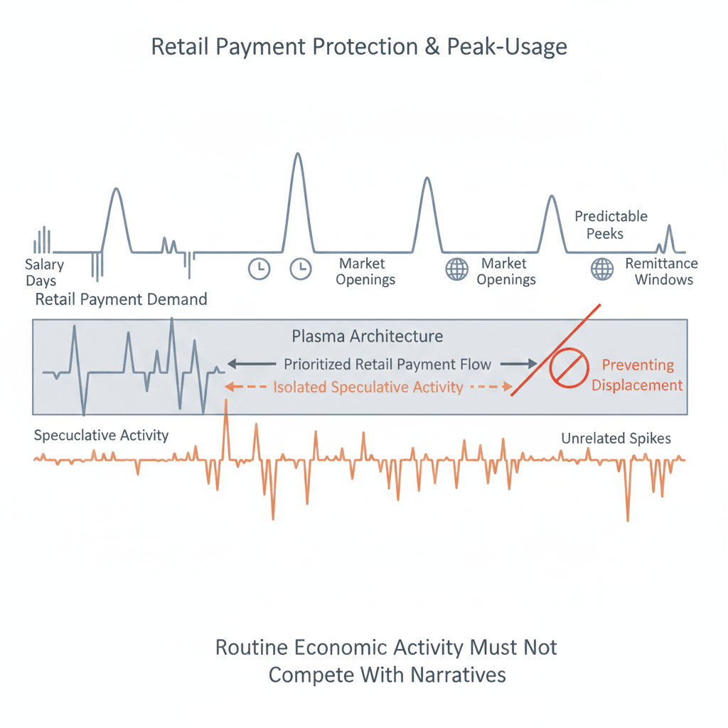 Плазма разработана для защиты непрерывности платежей в течение этих предсказуемых пиков. Это не о максимизации пропускной способности на бумаге. Это о том, чтобы гарантировать, что рутинная экономическая деятельность не была вытеснена несвязанным поведением в другой части сети.