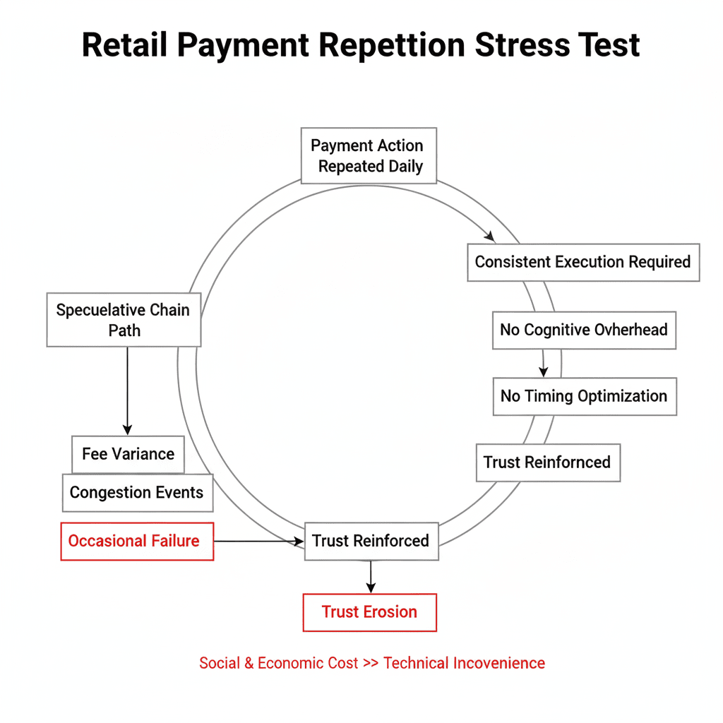 Первой проблемой, которую вводят розничные экономики, является повторение. Платежная система может успешно сработать один раз и все равно потерпеть неудачу как инфраструктура. Важно, может ли одно и то же действие выполняться десятки раз в день без когнитивных усилий или операционных сюрпризов. Спекулятивные цепочки часто добиваются успеха в всплесках — когда условия благоприятны, сборы низкие, а заторы отсутствуют. Розничное использование устраняет эти благоприятные условия.