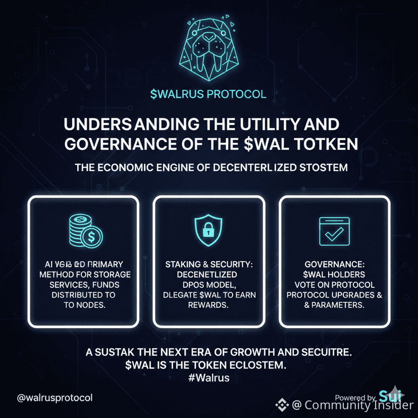 First, WAL is the main payment for storage services. Users prepay in advance for a certain period, and their funds are distributed among storage nodes within the time frame. Second, it secures the network through the model of dPoS. Token holders can delegate their $WAL to node operators to get rewarded while helping in verification at the same time. That #Walrus holders take a seat at the table and vote on protocol upgrades or key parameters. Finally, this creates a sustainable loop of growth and security for @Walrus 🦭/acc $WAL #walrus