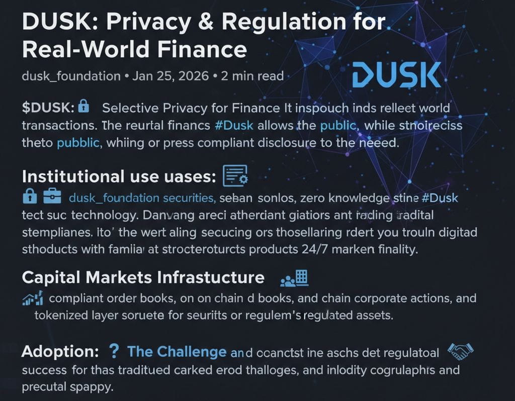 Of course, adoption is not guaranteed. Success for @Dusk will depend on convincing traditional institutions, fintechs, and regulators that its privacy by design approach is both safe and efficient. Still, in a market where many chains look similar, $DUSK stands out by aiming directly at regulated capital markets and building the cryptography needed to support them.