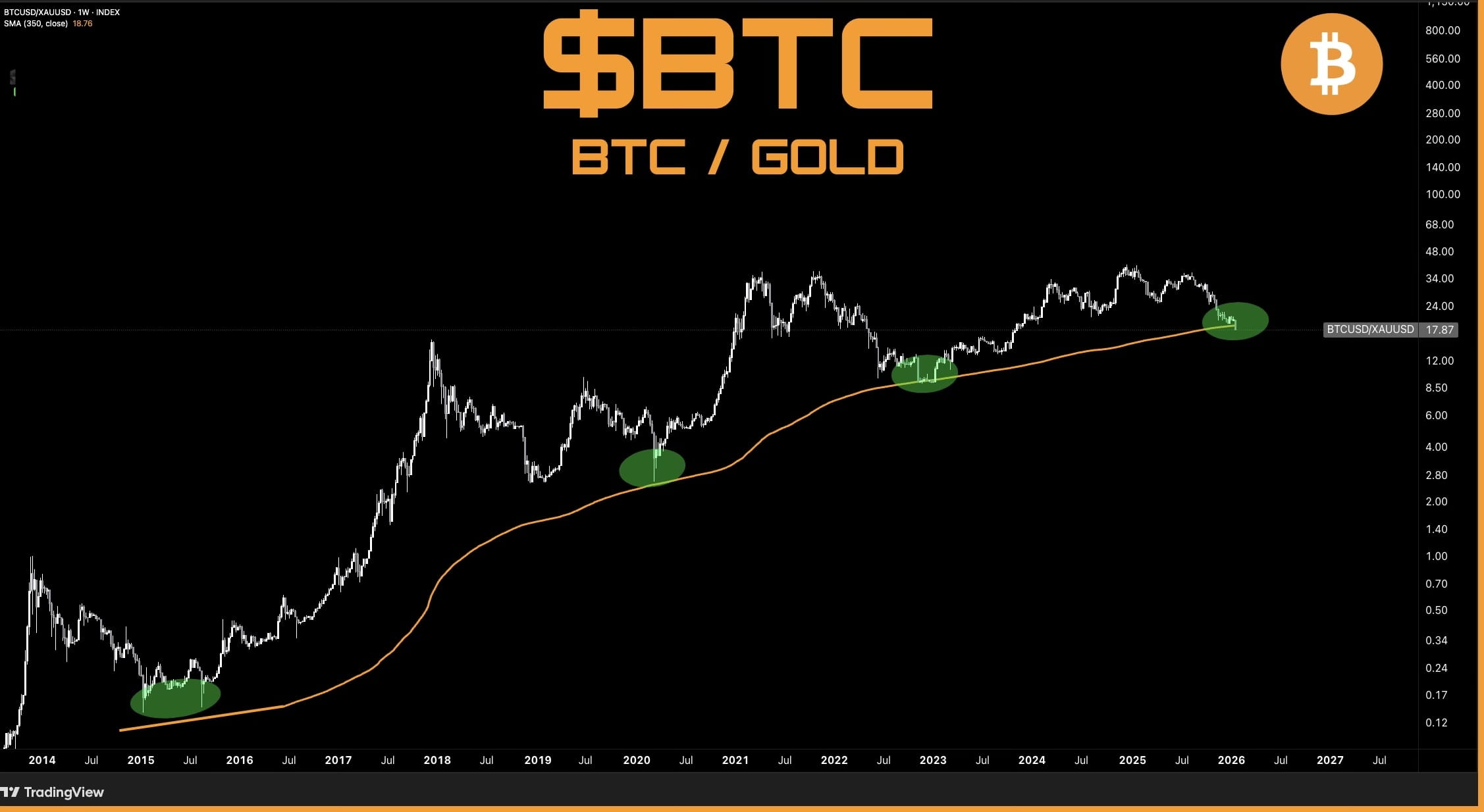 Когда Биткойн торгуется так дешево по сравнению с золотом, это исторически предшествовало периодам выхода BTC.