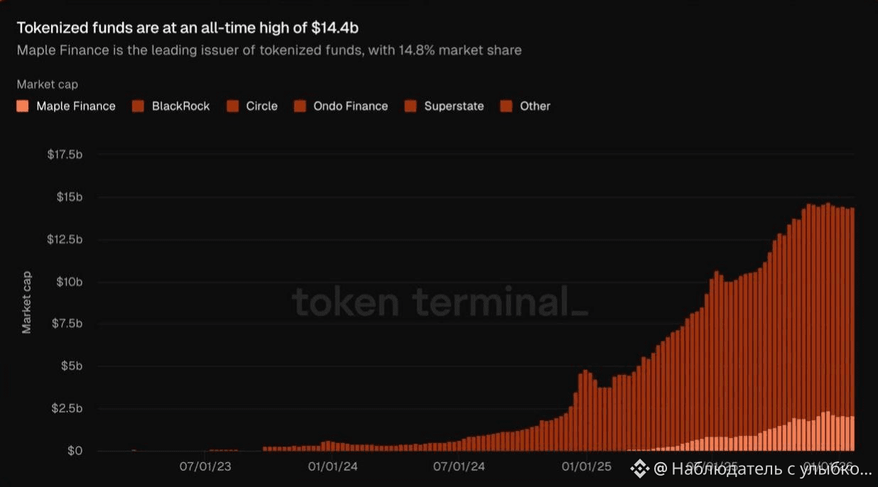 С точки зрения структуры рынка рост до 14,4 миллиарда долларов отражает устойчивый выпуск и удержание, а не спекулятивные всплески. Расширение вклада нескольких эмитентов означает, что токенизация становится каналом оперативного финансирования, а не просто пилотной программой.