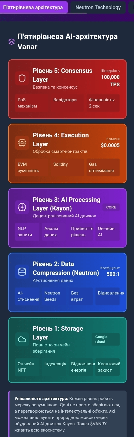 Большинство блокчейнов обещают вам собственность над NFT, но на самом деле вы получаете только ссылку на изображение, которое где-то лежит на сервере Amazon или IPFS. Когда сервис падает — прощайте, ваш "уникальный" актив. Именно эту иллюзию команда @Vanarchain решила развеять навсегда, создав что-то действительно революционное. Vanar Chain — это не просто еще одна быстрая сеть с красивыми обещаниями. Это первый блокчейн, который встроил искусственный интеллект непосредственно в свою ДНК через пятирівневую архитектуру, где каждый слой делает сеть умнее. Представьте себе zip-архив, который живет внутри блока, понимает, что внутри него хранится и может самостоятельно это анализировать.