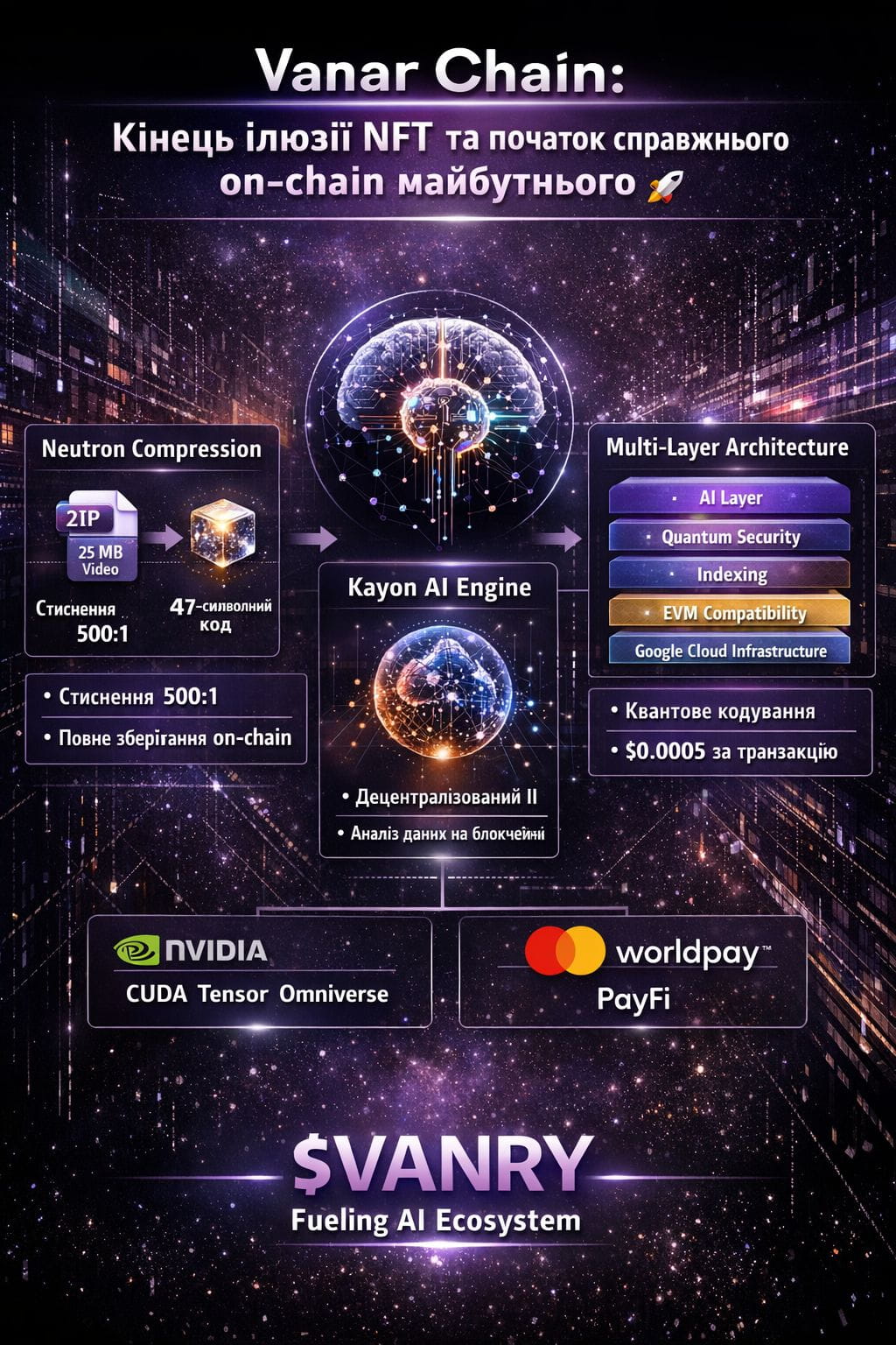 А тепер уявіть наступний рівень — Kayon, децентралізований движок штучного інтелекту, який читає ці Seeds, розуміє контекст, зв'язки між даними і може приймати рішення. Це не якийсь зовнішній API, який може впасти разом з AWS — це логіка, вбудована в сам ланцюг. Коли AWS впав у квітні 2025 року і великі біржі зависли, Vanar продовжував працювати, бо його дані живуть он-чейн. Технічна магія криється у чотириступеневому конвеєрі: AI-стиснення, квантово-захищене кодування (так, вони готуються до епохи квантових комп'ютерів), індексація для швидкого пошуку та детерміністичне відновлення. Для розробників це означає EVM-сумісність із повними SDK для JavaScript, Python та Rust, фіксовану комісію $0.0005 за транзакцію та інфраструктуру Google Cloud на відновлюваній енергії. Токен $VANRY тут не просто газ — він паливо для всієї AI-екосистеми, від стейкінгу до оплати за AI-інструменти, що робить його унікальним у своєму роді. Партнерства з NVIDIA дають доступ до CUDA, Tensor, Omniverse для розробників, а інтеграція з Worldpay та Mastercard відкриває двері до PayFi — токенізованих реальних активів із вбудованою комплаєнс-перевіркою через Kayon.