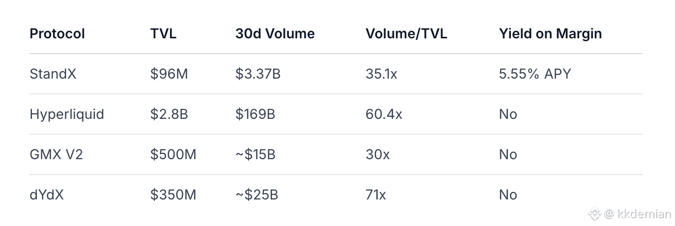 StandX represents a structural innovation in perpetuals trading through its yield-bearing margin system, achieving superior capital efficiency while maintaining competitive trading performance. The protocol's $96M TVL generating $3.37B monthly volume demonstrates exceptional capital velocity that exceeds most established venues.