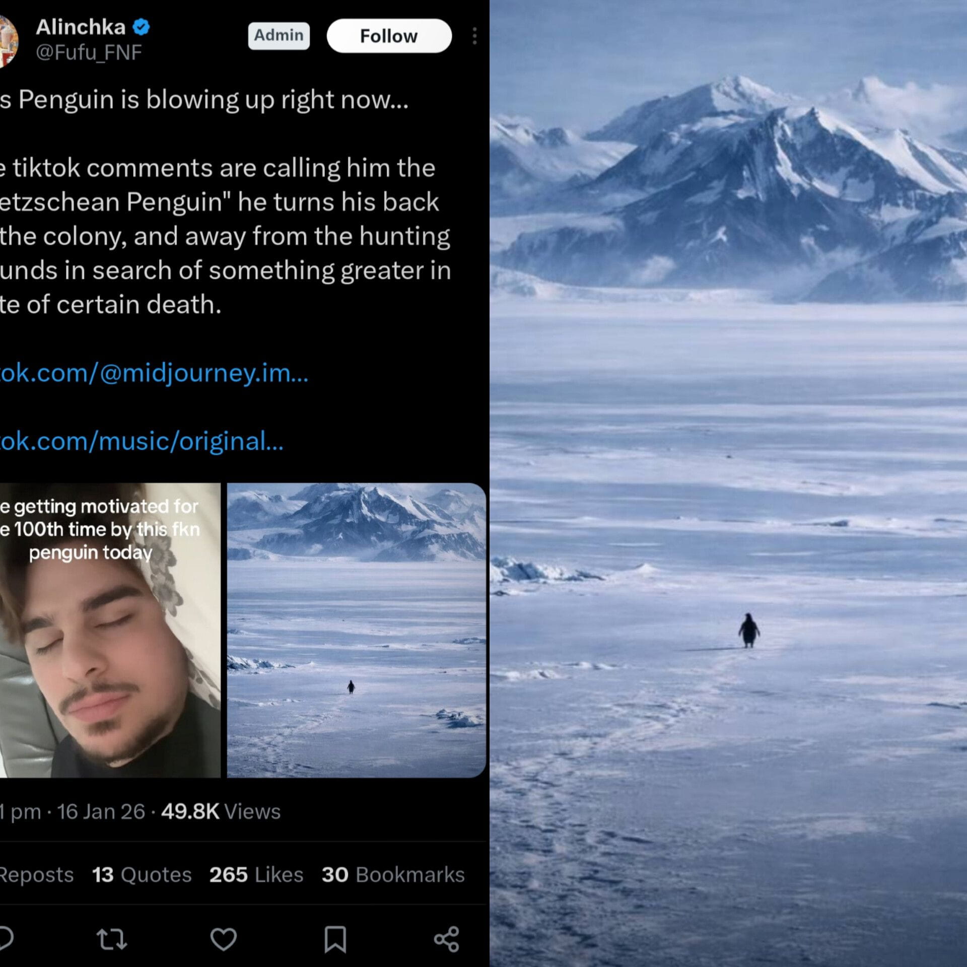 В вирусных роликах, распространяющихся по TikTok и Twitter, мы наблюдаем, как одинокий пингвин уходит от своей колонии в бескрайние антарктические просторы.❄️ Никаких сокращений, никакого колебания — просто крошечное существо, пересекающее замороженный мир, состоящий из гор и ветра.🏔️🌬️