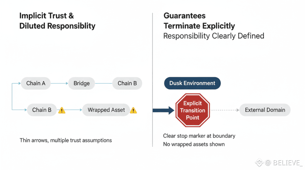 Instead, the design favors explicit transition points. When value moves out of Dusk’s environment—or interacts with external logic—the protocol requires clear accounting, clear termination of guarantees, and clear responsibility. There is no illusion that privacy or enforcement magically persists beyond the system that enforces it.