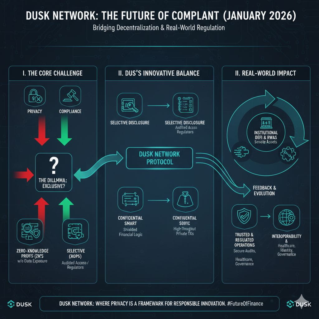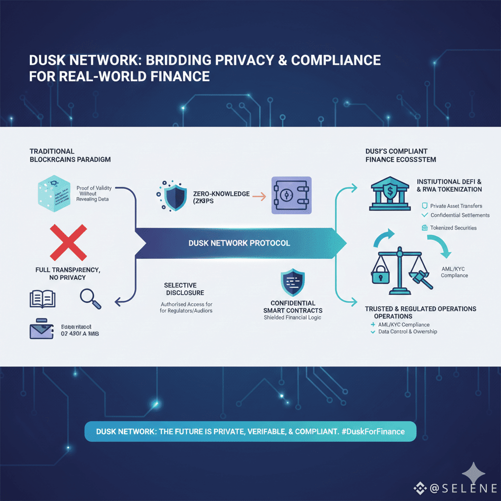 In conclusion Dusk Network exemplifies how privacy and regulatory compliance can coexist harmoniously. By leveraging zero-knowledge proofs selective disclosure and efficient network architecture it creates an ecosystem where transactions remain confidential but verifiable where compliance is achievable without sacrificing privacy and where users can trust that their sensitive data is handled responsibly. In a world where digital finance increasingly intersects with law ethics and innovation Dusk offers a roadmap for building blockchains that respect both the individual and the system a foundation where privacy doesn’t mean isolation and compliance doesn’t mean exposure.