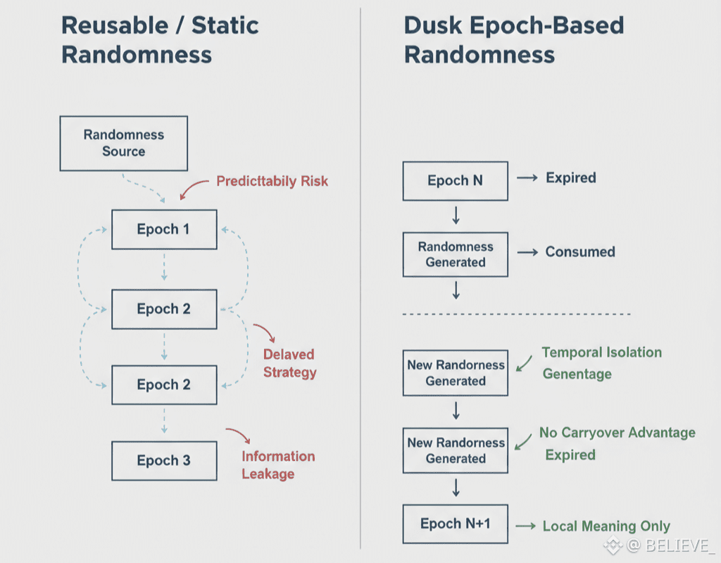 Instead of relying on a single, static randomness source, Dusk ties randomness to epochs, with clearly defined lifecycle boundaries. Randomness is generated, consumed, and retired in a structured way. Once an epoch ends, its randomness is no longer reusable. That temporal isolation matters because it prevents participants from carrying informational advantages forward.