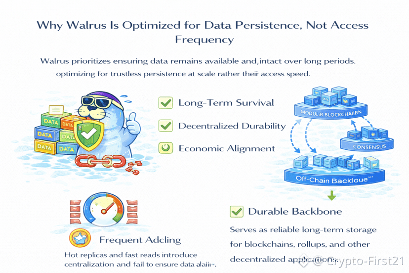 Walrus fits naturally into a modular architecture for Web3. Blockchains, rollups, social networks, and archival systems often need strong guarantees that data will exist tomorrow, next year, or a decade from now, regardless of how often it is accessed. Walrus fills this role as a durable data backbone, while leaving fast access to specialized layers built on top. By separating persistence from access frequency, Walrus avoids unnecessary trade-offs and delivers what decentralized storage needs most: reliability without central trust.