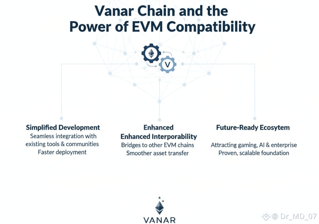 In the world of blockchain, technical choices can make or break a project’s chances of real adoption.@Vanarchain ’s decision to go with Ethereum Virtual Machine (EVM) compatibility isn’t just about following the crowd. It’s a practical move one that’s all about making things easier for developers and growing the ecosystem. By choosing the EVM standard, Vanar meets developers where they already are. There’s no need for anyone to start from scratch or pick up a whole new toolkit. This approach says a lot about Vanar’s mindset: keep it simple, focus on what people actually want, and skip the unnecessary complexity.