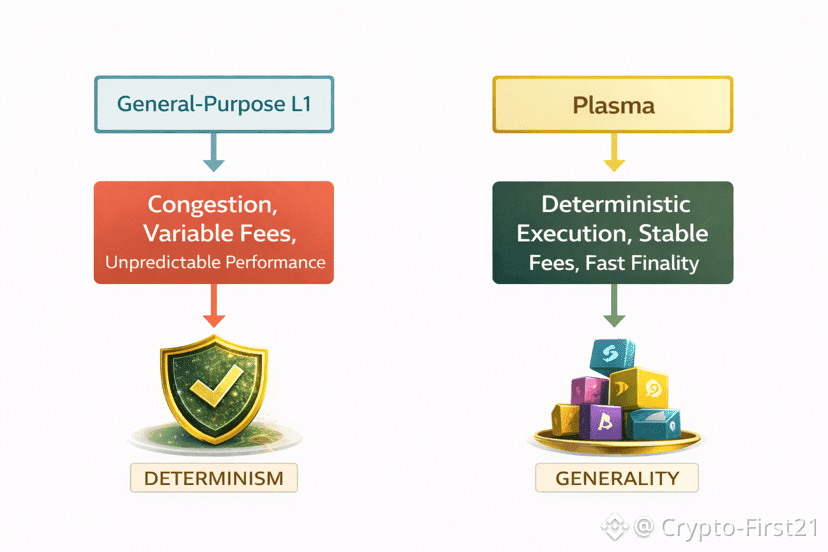 Most blockchains today are built around a single idea: generality. They aim to support every possible use case, DeFi, NFTs, gaming, social apps, experiments, within one shared execution environment. While this flexibility has driven innovation, it has also created a fundamental problem, unpredictable performance. For systems meant to move money at scale, unpredictability is not a feature, it is a failure. Plasma is built on the opposite philosophy, deterministic performance over generality, and that choice defines everything about its design.