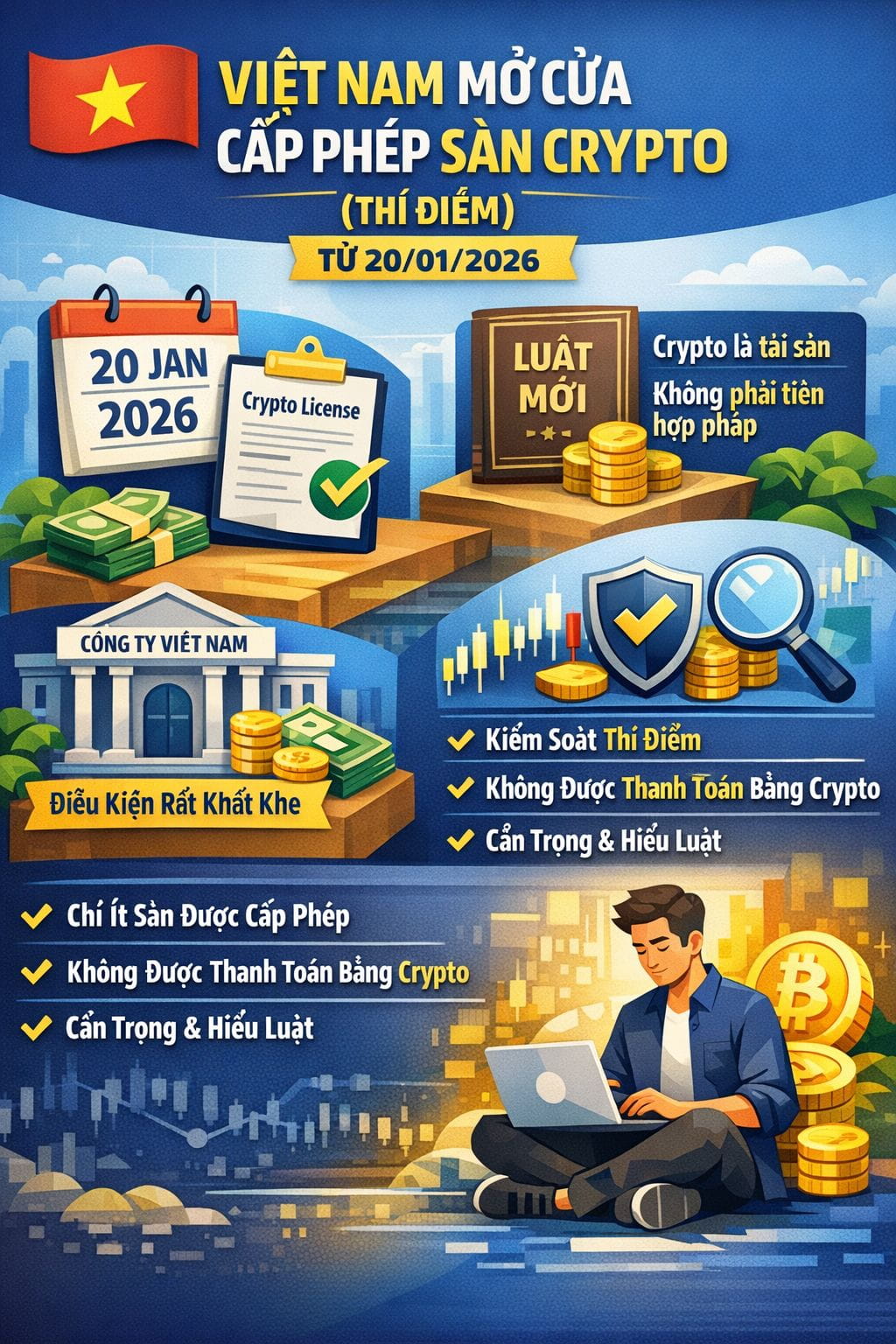 Từ 20/01/2026, Việt Nam chính thức bắt đầu nhận hồ sơ xin cấp phép cho các sàn giao dịch tài sản số. Đây là chương trình thí điểm kéo dài 5 năm, nhằm thử nghiệm cách quản lý thị trường crypto một cách an toàn.