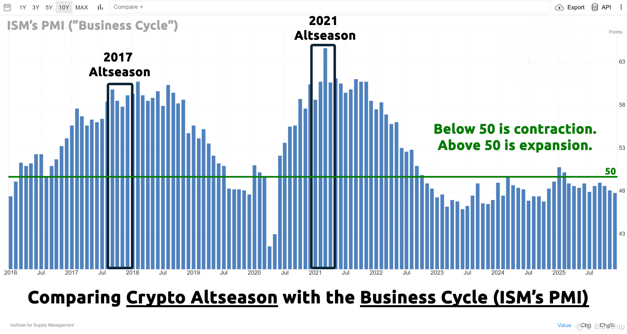 See the second chart for the ISM's PMI as it relates to past crypto altcoin cycles. It becomes pretty clear that the current environment is not like the past Altseasons. The high Fed Funds rate doesn't help.