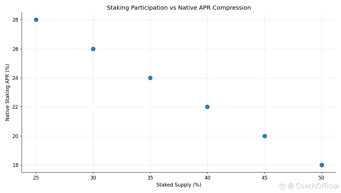 A while back, I was staking on a privacy-focused chain, expecting the usual tradeoff. Lock tokens, earn yield, let time do its thing. What caught my attention wasn’t volatility, but how quietly the circulating supply kept expanding. Rewards landed on schedule, the network ran fine, yet my slice of the pie was getting thinner month by month. Nothing dramatic. Just that slow realization that emissions can feel harmless until you zoom out.