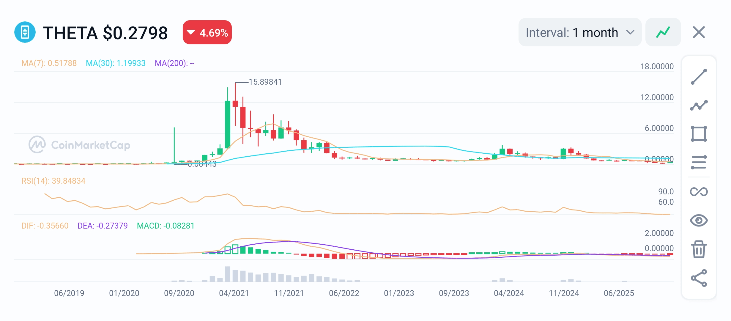 Помните $THETA пампинг до $15+ в 2021 году на децентрализованных видеомечтах? Партнерства с Samsung/Google подняли его на ноги, но он рухнул из-за следующих причин: