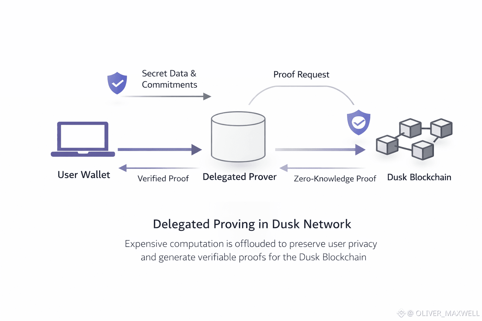 Because Dusk bakes privacy and auditability into the base layer, a transaction often carries more than a signature and a balance delta. A privacy-preserving state update must persuade the network that policy rules were satisfied while keeping the underlying facts sealed. Those proof-heavy steps are where Dusk’s UX can fracture, because generating proofs, managing encrypted state, and enforcing selective disclosure can overwhelm typical client devices and stall time-sensitive payment or trading flows. Dusk’s delegation model answers that bottleneck with a simple stance: keep secrets and intent close to the user, move the expensive computation to a delegated execution path, and return an artifact that the chain can verify quickly. Delegation only works on Dusk because validators still verify the returned proof against the transaction’s public commitments before any state update is accepted.
