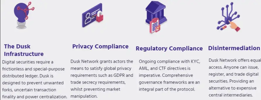 Идентификация и соблюдение нормативных требований встроены в протокол. Благодаря выборочной системе раскрытия информации Dusk участники подтверждают соблюдение нормативных требований, таких как KYC и AML, не раскрывая больше данных, чем необходимо. Учреждения могут уверенно подключаться к сети, зная, что они соответствуют юридическим стандартам, защищая при этом информацию клиентов.