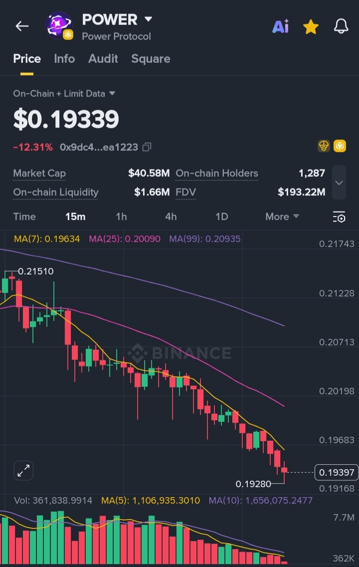 Текущая цена составляет около $0.19339, снизившись примерно на 12.31%, что указывает на сильное давление со стороны продавцов в недавней сессии.