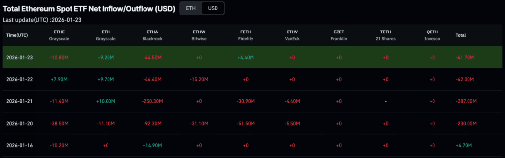 Наибольший однодневный отток произошел 21 января, когда ETHA потерял около $250.3 миллионов. За ним последовали дальнейшие снижения на $92.3 миллионов 20 января, $44.4 миллиона 22 января и $44.5 миллионов 23 января, которые были лишь немного компенсированы притоком в $14.9 миллионов 16 января.