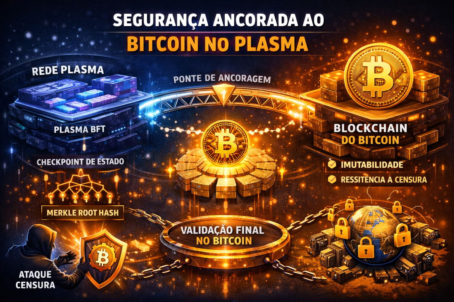 Em síntese, a segurança ancorada ao Bitcoin no Plasma é projetada para fornecer um modelo de confiança externo altamente resistente, neutralizando, na prática, grande parte dos riscos potenciais de censura que poderiam existir em uma blockchain independente. Essa integração estratégica com a blockchain mais segura e descentralizada do ecossistema cria uma base técnica robusta para aplicações de stablecoin de escala global.