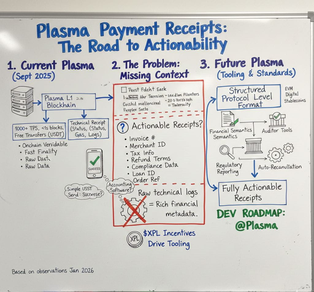 The explanation of why receipts are still not quite actionable boils down to lack of standardization and equipment to support more complex, machine-readable formats than simple technical information. Receipts can be actionable in a traditional finance or business setting since they contain context: invoice numbers, merchant numbers, tax structuring, refund terms, or compliance information. On Plasma today, the receipts containing raw execution output (success/failure, logs whether emitted by contracts) do not have a structured protocol level format of rich payment metadata (as seen in lenders, auditors, or accounting systems) that can be automatically decoded and responded to without offchain parsing.