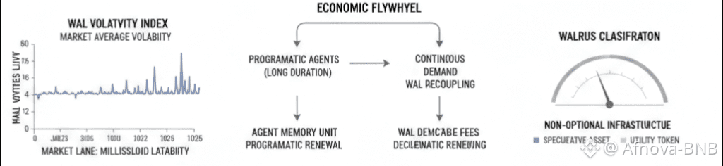 The economic flywheel finally snaps into focus when I stop thinking about users and start thinking about agents. Humans respond emotionally to costs. Machines don’t. An agent that needs storage, renews automatically, and pays fees programmatically creates demand that’s detached from sentiment. When that happens, WAL demand decouples from narratives altogether. Volatility compresses not because interest disappears, but because discretionary selling does. Markets misread that every time. Then they overcorrect.