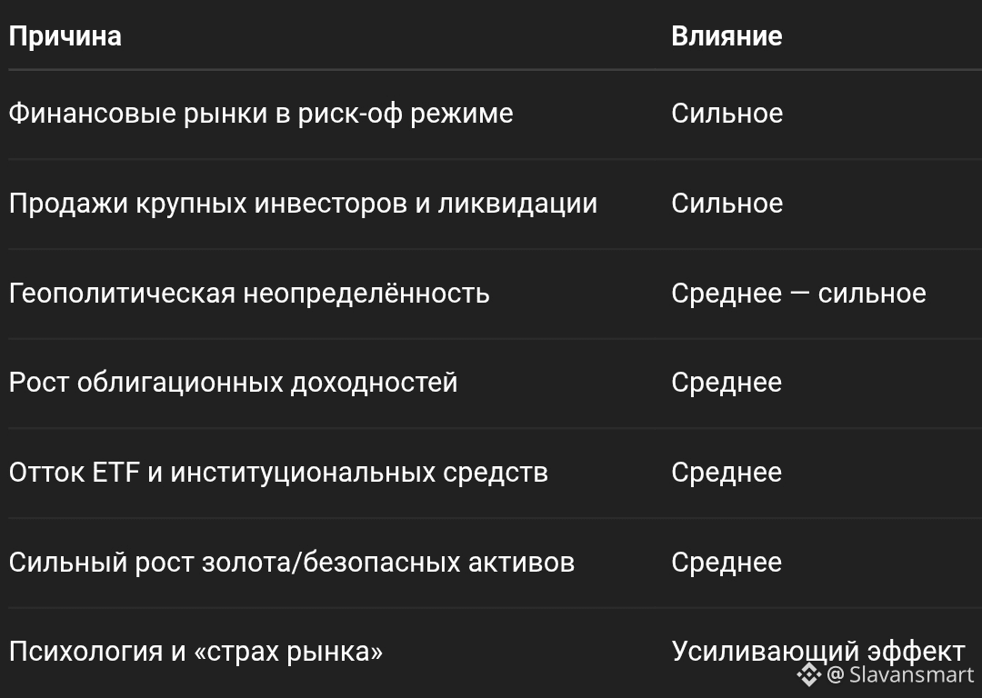 Возврат средств из Bitcoin ETF и сокращение институционального участия создаёт дополнительное предложение на рынке и усиливает давление на цены.