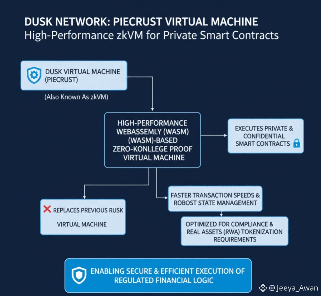 The Dusk Virtual Machine (also known as Piecrust) is a high-performance WebAssembly (WASM)-based zero-knowledge proof (zkVM) virtual machine designed specifically for Dusk networks to execute private and confidential smart contracts. Paycrest replaces the previous Rask Virtual Machine, offering faster transaction speeds and more robust state management, and is optimized for compliance and Real Assets (RWA) documentation requirements.