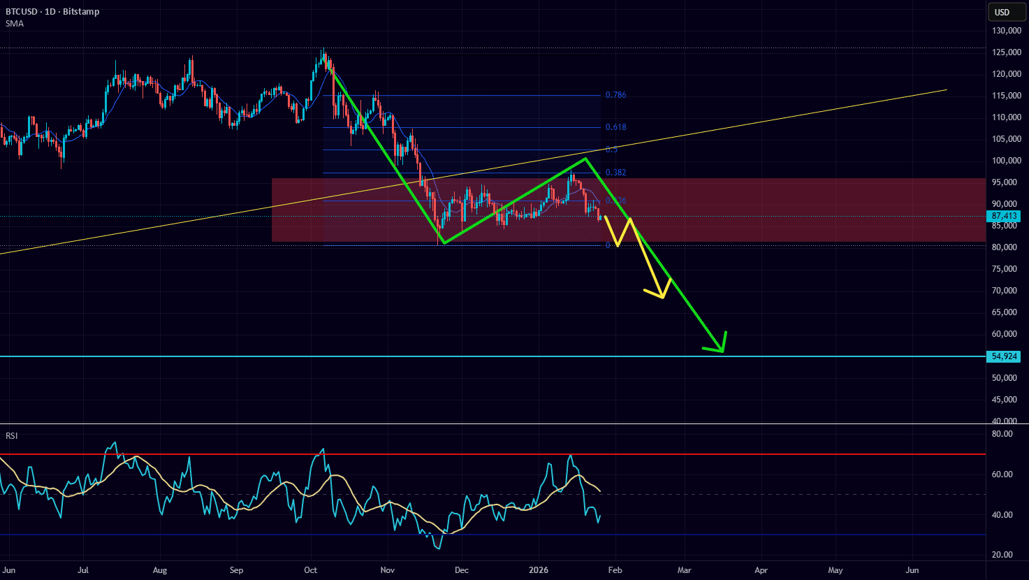 Продавайте на откате в 86,500–88,000 (предыдущая поддержка, ставшая сопротивлением)