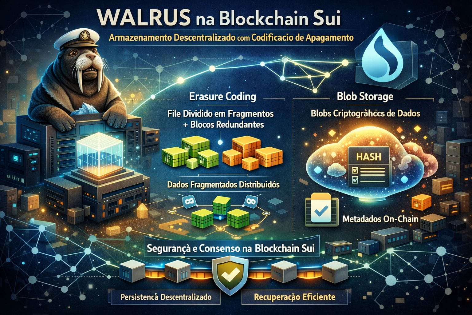 A operação da WALRUS na Sui se beneficia do modelo orientado a objetos da blockchain, permitindo gerenciamento eficiente de estados, paralelismo na verificação e alta escalabilidade. Essa integração cria um sistema onde grandes arquivos podem ser armazenados de forma descentralizada, com garantias criptográficas fortes, baixa latência de recuperação e alinhamento total com os princípios de segurança e desempenho da Sui.
