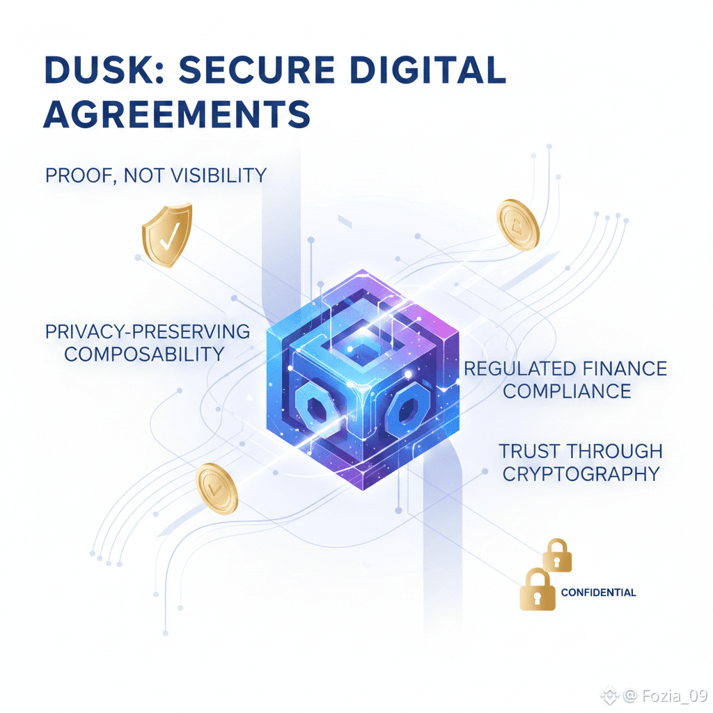 At the center of Dusk’s approach lies a clear idea:agreements need to be enforceable by proof,not by visibility.You can show you’ve met the terms no need to reveal your identity,account balances,or even how the contract works inside.This matters even more in regulated industries,where keeping things confidential isn’t just a preference,it’s the law.Dusk manages to let agreements run and be audited,all while keeping strict limits on what information crosses the line.