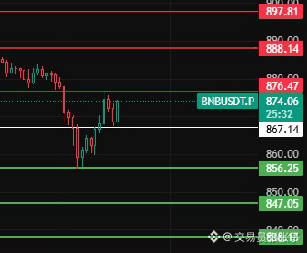 BNB今天留意867这个位置,只要1小时级别不跌破此位置那继续走反弹行情,往上上方压力位留意876-888-898这几个位置附近!