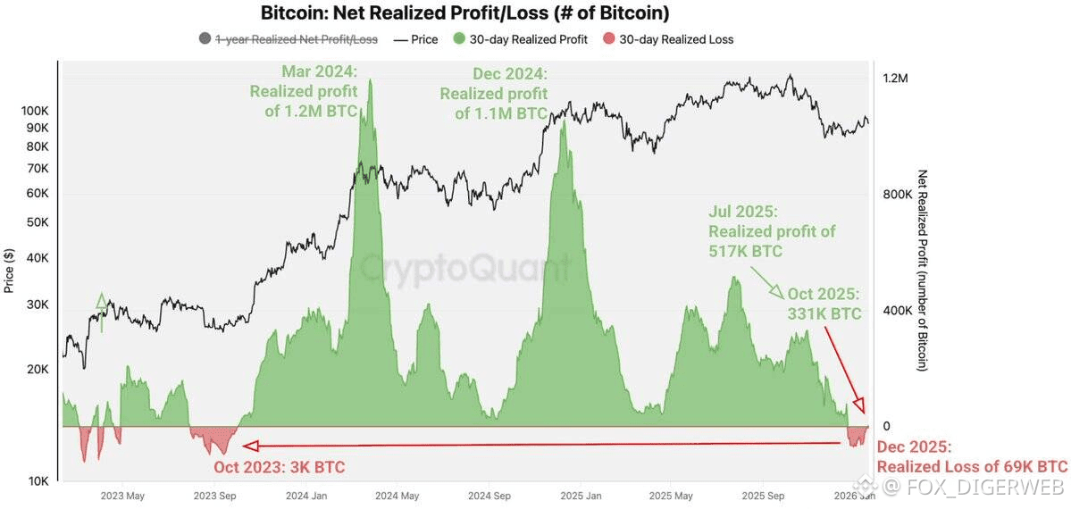 Looking closer one figure keeps resurfacing. Since December about sixty-nine thousand Bitcoin have been sold below their purchase price. At today’s valuations that represents over six billion dollars. These aren’t traders locking in gains after a rally. They’re long-term holders who waited longer than expected and finally hit their limit. They’re exiting because they feel stuck not because they feel clever. That type of selling presses on a market in a way profit-taking never does.