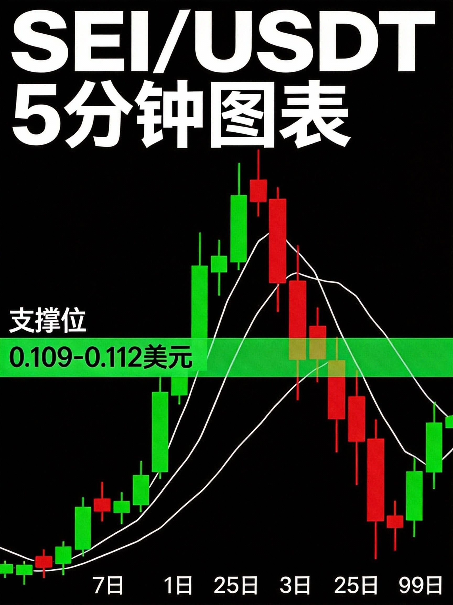 Рисунок 1: $SEI/USDT 5-минутные свечи, наложенные на 7-дневные, 25-дневные и 99-дневные скользящие средние. Поддержка формируется в диапазоне 0.109-0.112 долларов.