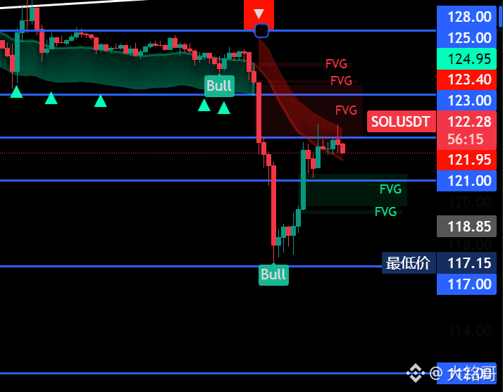 SOL今天反弹有一丢丢的弱,今天需要留意121这个位置,一小时级别不破此位置,反弹会继续,下方支撑位留意117-115-112位置附近!如果能站稳121,那么上方的压力位留意123-125-128这几个位置附近!