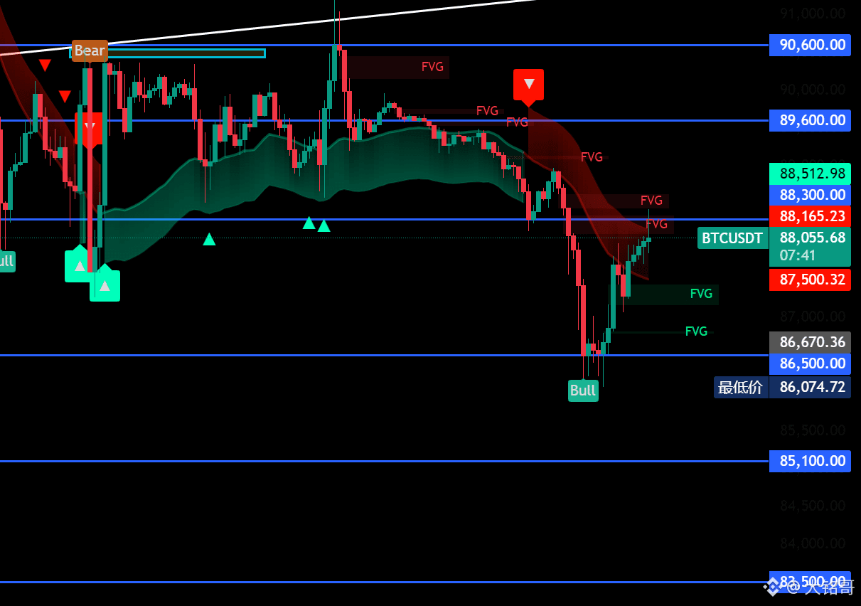 向下回踩还将继续,支撑位留意86500-85100-83500这几个位置附近!上方压力位留意88300-89600-90600这几个位置附近!