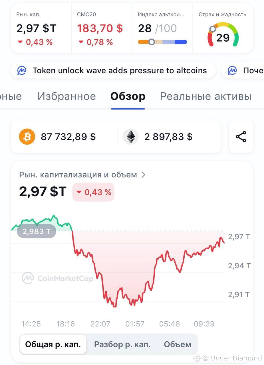 Общая капитализация рынка: Вновь опустилась ниже психологически важной отметки в $3 трлн, составив около $2,97 трлн (-1% за 24 часа).