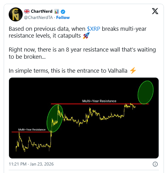 Исторические данные показывают, что когда XRP преодолевает такое многолетнее сопротивление, актив часто испытывает ускоренные приросты. Согласно аналитикам, преодоление этого сопротивления — это вход XRP в Вальгаллу.