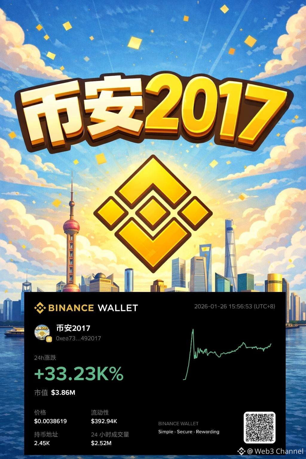 一个新创建的钱包地址在今天转入30万美元开始持续购买一个meme代币“币安2017”,目前购买仓位已幅盈50%