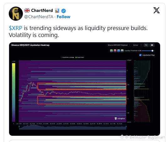 $XRP has entered a period of sideways movement, signaling that liquidity pressure is accumulating. Recent analysis by crypto analyst ChartNerd (@ChartNerdTA) highlights this development on the Binance XRP/USDT liquidation heatmap. The asset is trading within defined ranges while the market prepares for its next phase of momentum.