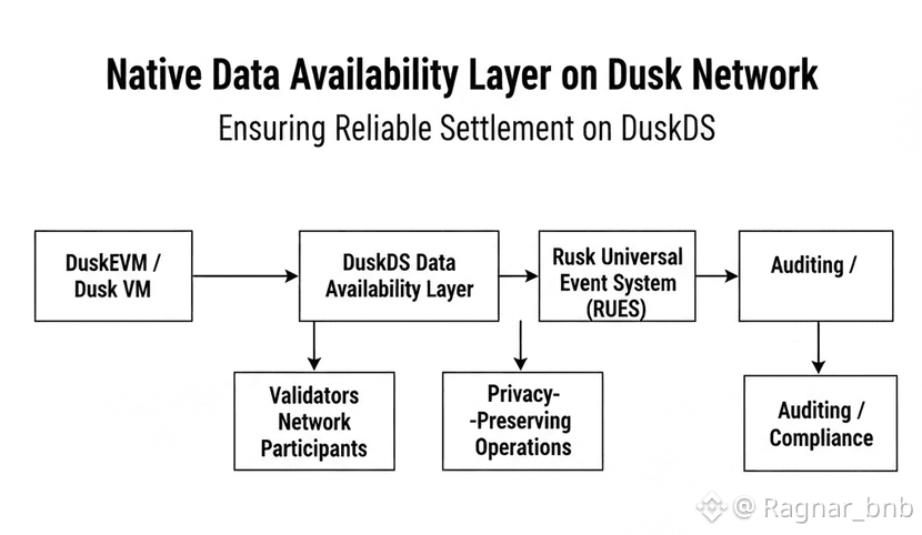 Here on the Dusk Network, we built a special system called a native data availability layer on DuskDS. Think of it as the thing that makes sure everything that happens, like transactions, updates, and smart contract stuff, is reliably put out there, kept safe, and easy to get to for everyone on the network. It’s super important because it backs our privacy features and keeps things running smoothly and by the rules. It makes sure that anything that happens on the blockchain can be checked and proven to be true.