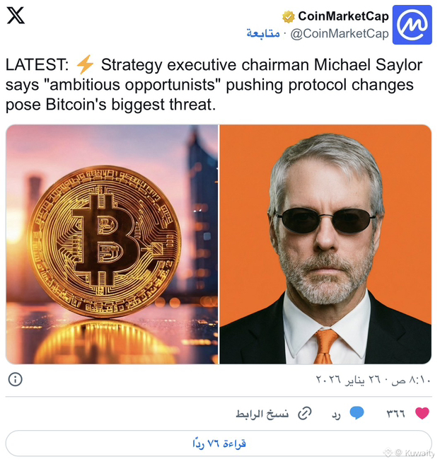 • يقول مايكل سايلور إن أكبر خطر يواجه البيتكوين يأتي من تغييرات البروتوكول، وليس من التهديدات الخارجية.